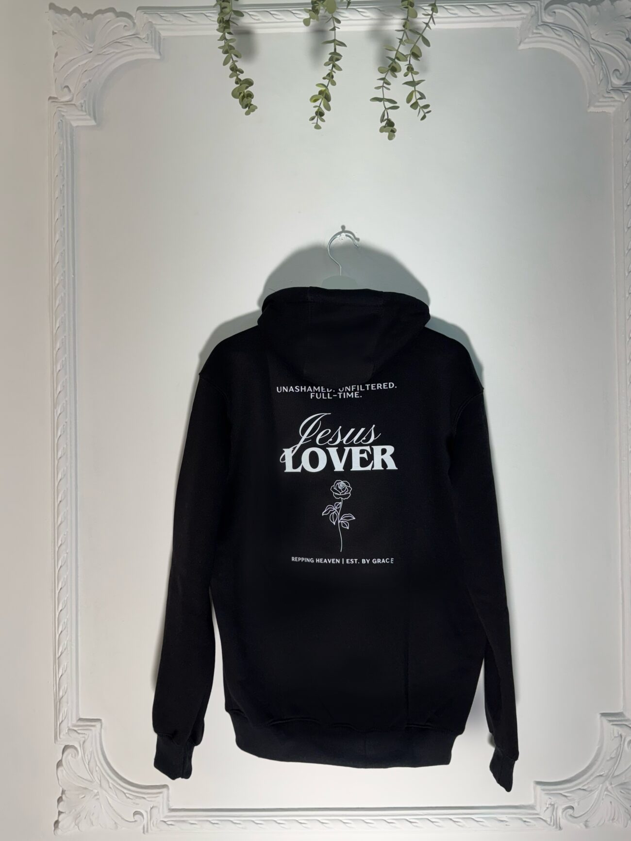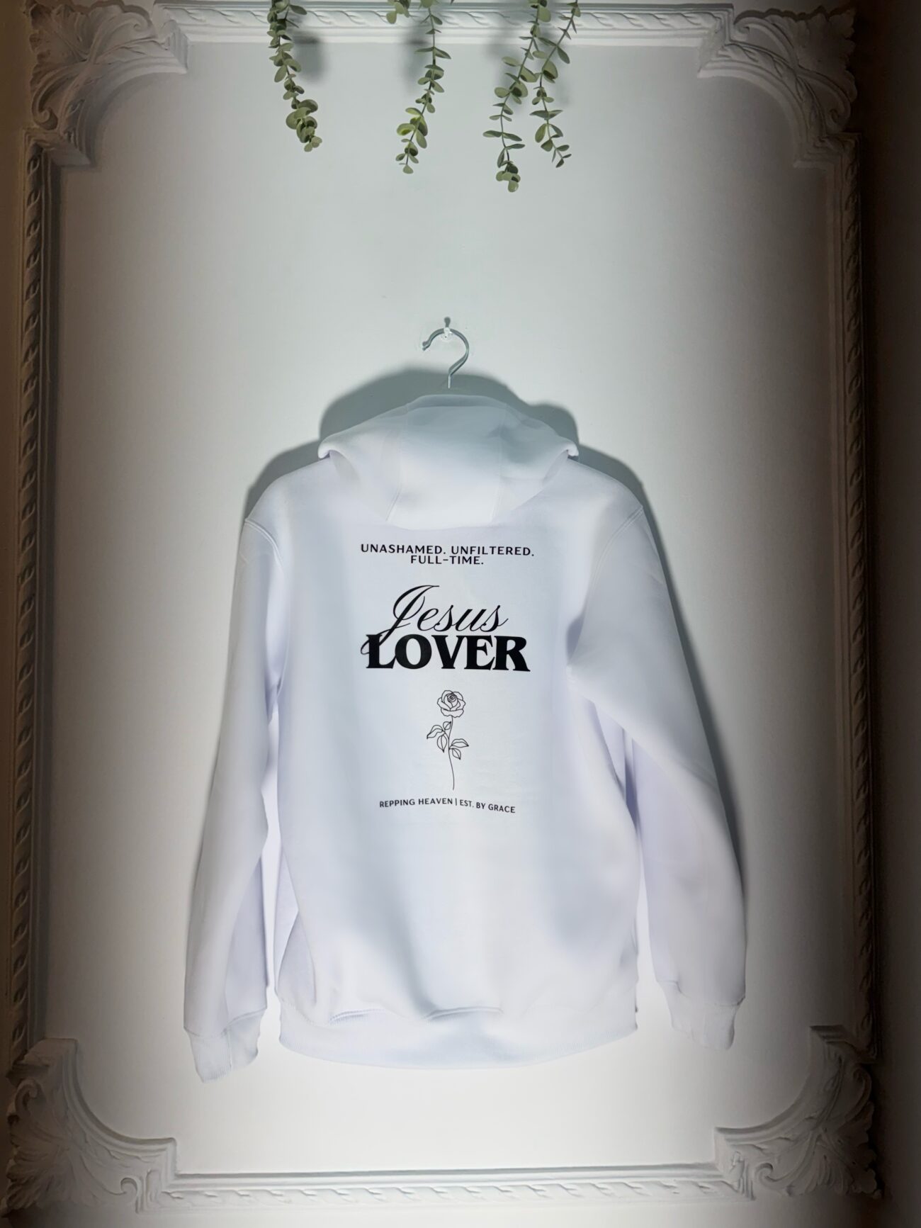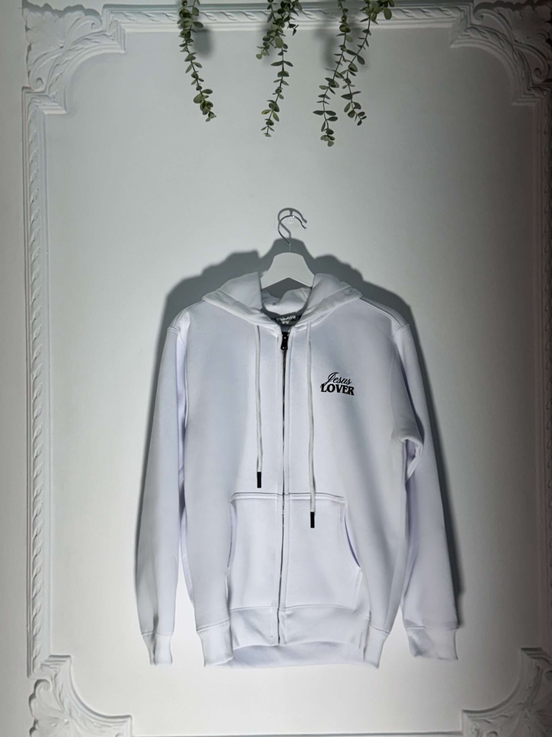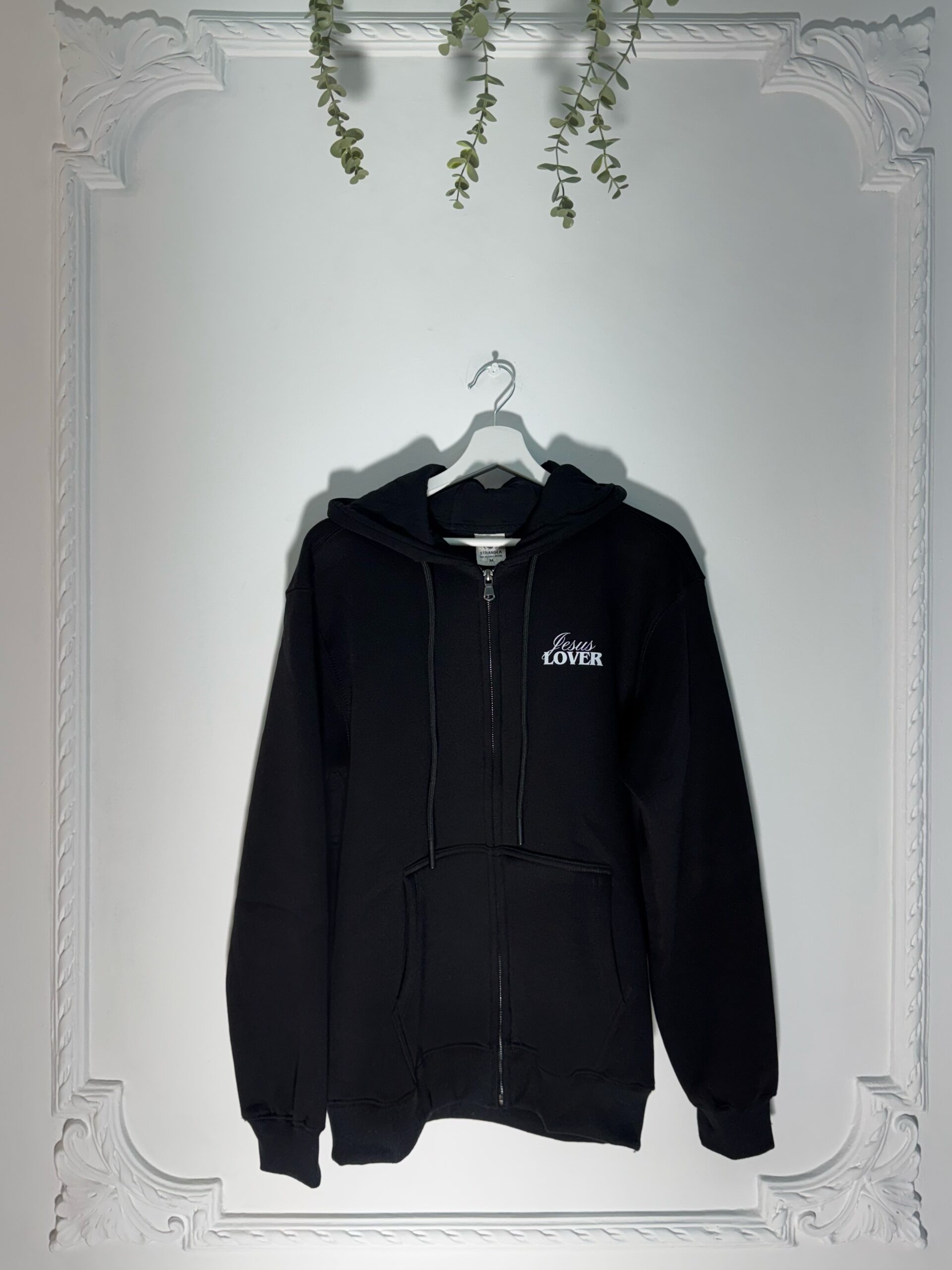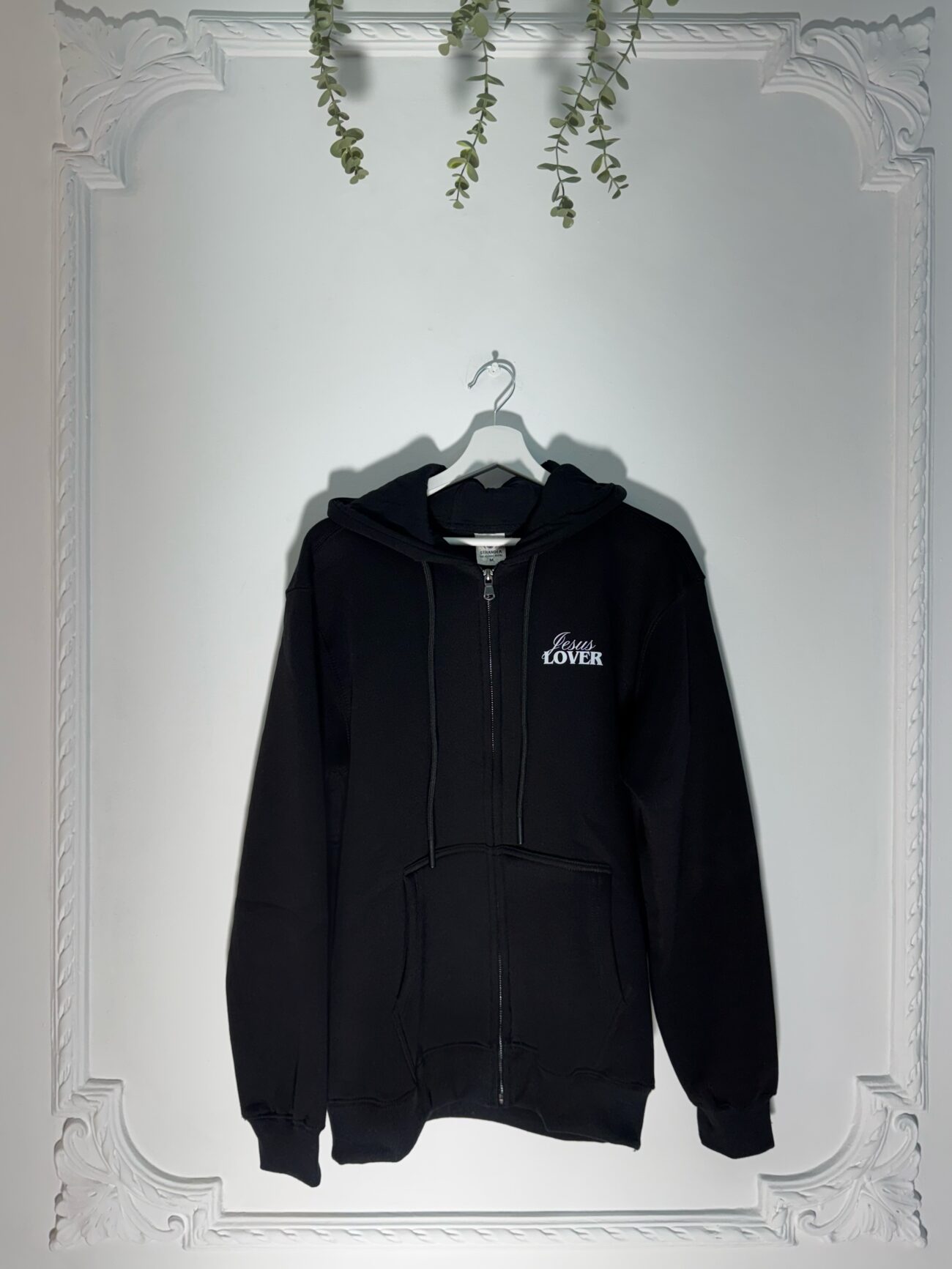 Ένα σύγχρονο zipper jacket με minimal μπροστινή παρουσία, όπου το “Jesus Lover” αποδίδεται διακριτικά στο στήθος, δίνοντας καθαρή ταυτότητα στο κομμάτι.