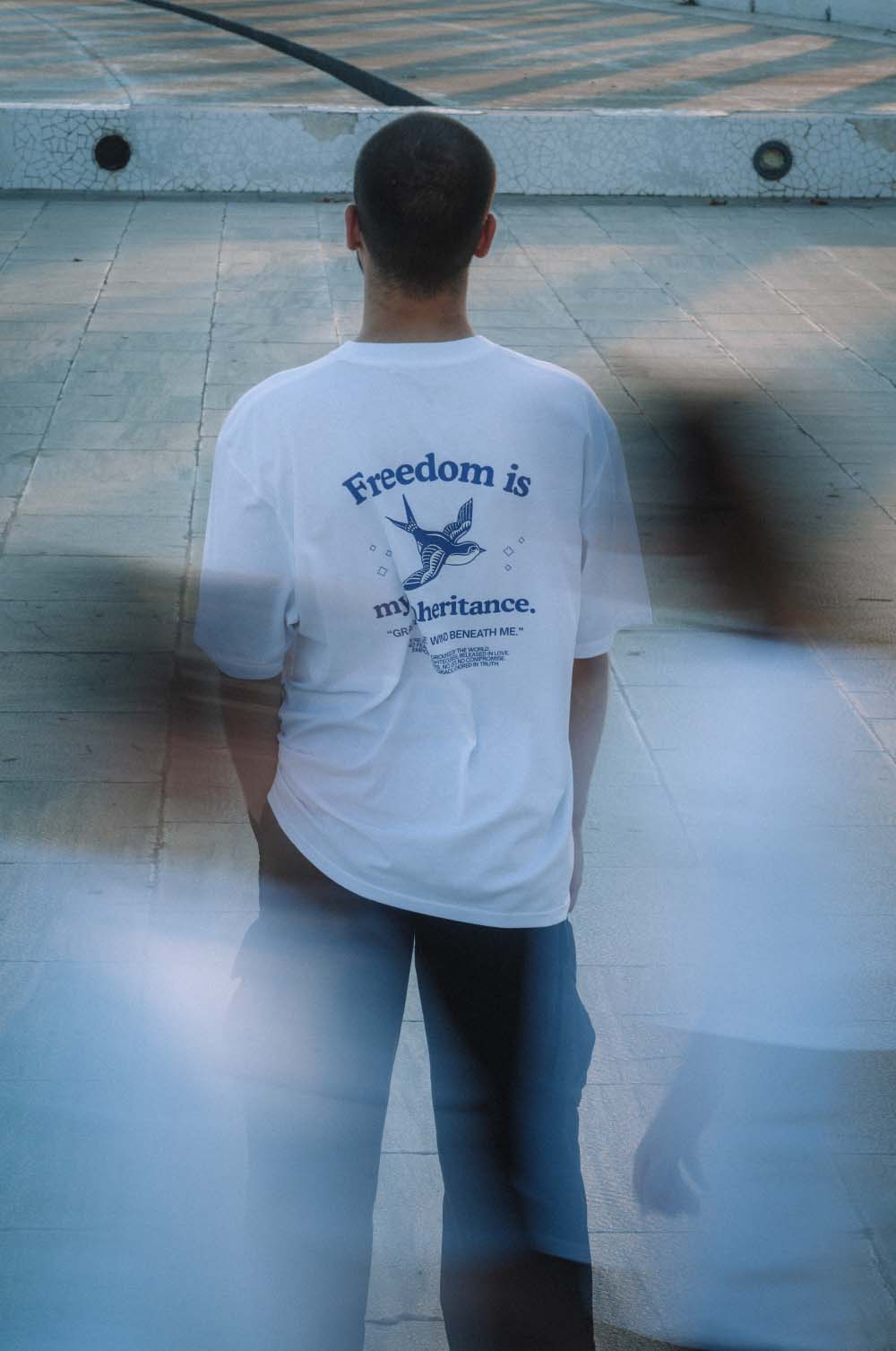 Λευκό oversized T-shirt με έντονο navy blue print. Στο μπροστινό μέρος ξεχωρίζει το minimal μήνυμα “Freedom is my inheritance”, ενώ στην πλάτη κυριαρχεί το δυναμικό σχέδιο με χελιδόνι και bold lettering, αποπνέοντας αίσθηση ελευθερίας και χάρης. Ένα statement κομμάτι που συνδυάζει streetwear αισθητική με έμπνευση.